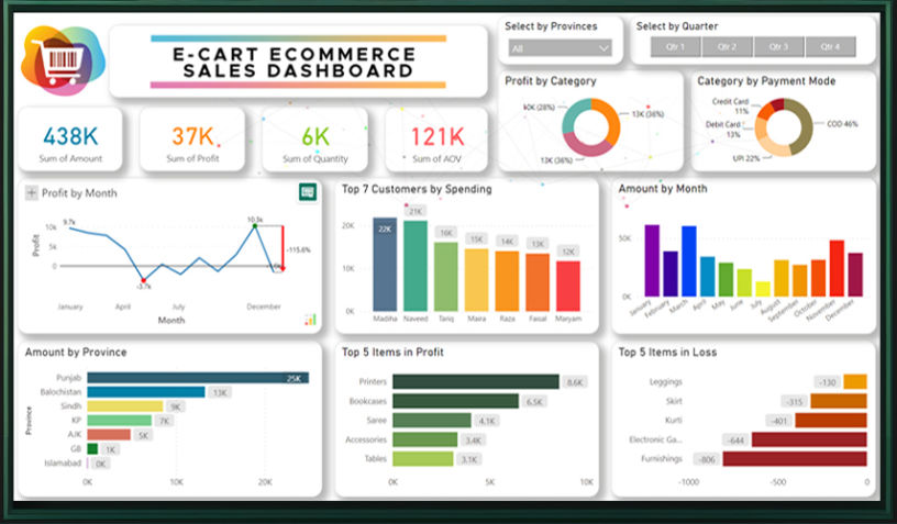This dashboard provides an overview of E-Cart ecommerce sales performance. It includes metrics such as revenue, order volume, conversion rate, and average order value, and allows company to track trends over time to identify opportunities for growth.