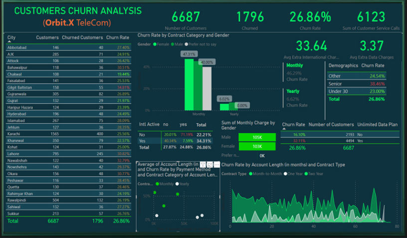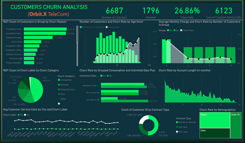 Designed specifically for the telecom industry, this customer churn dashboard allows telecom providers to effectively monitor and analyze customer churn rates. With intuitive visualizations and real-time data, it helps identify factors influencing customer churn, such as service quality, pricing plans, and customer satisfaction.