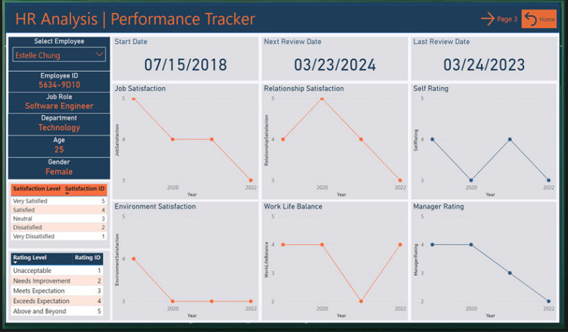 It presents key metrics such as performance ratings, goal achievements, training completion, and attrition rates, enabling HR teams to identify top performers, assess training effectiveness, and track attrition trends.